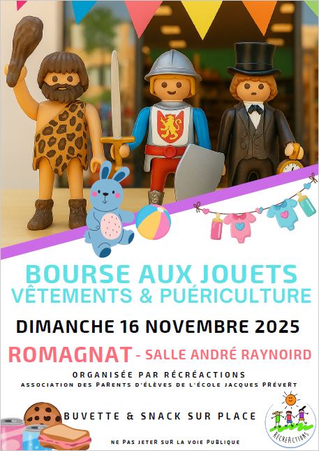 RécréAction organise la 7ème édition de la Bourse aux jouets, vêtements d’enfants et matériel de puériculture, le dimanche 16 novembre 2025 de 9h à 18h dans la salle André Raynoird de Romagnat.